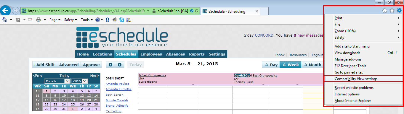 If you’re using Internet Explorer (IE) and have noticed that not all functionality is working as it should be, it’s because eSchedule has been added to your browsers “Compatibility View Settings”. There are 3 quick steps to resolve this: